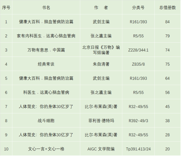 综合图书类图书的借阅量较高,体现了读者对跨学科知识的兴趣,有助于拓宽视野和知识面,应对新时代的复合型人才需求。《健康大百科》系列被医院列为健康科普推荐书目。